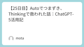 AIブログ企画 【25日目】Autoでつまずき、Thinkingで救われた話:ChatGPT-5活用記 非エンジニア管理人がChatGPT-5のThinkingモードで開発効率を改善。Autoとの違いと使い分けの実践記録。 2025.09.24 AIブログ企画ソフトウェア・ツールパソコンパソコン困りごと